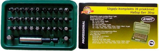 Uzgaļi 25mm: PH1, PH2, PH3, PZ1-2pcs., PZ2-2pcs., PZ3-2pcs., T10, T15, T20-2pcs.,T25-2pcs.,T27-2pcs.,T20-2pcs.,T30-2pcs.,T40-2pcs.,T10H,T15H,T20H,T25H,T27H,T30H. Bitholder 60mm; adapter for sockets 1/4' 25mm