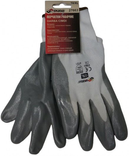 10', poliesters, nitrila pārklājums ar glūdu virsmu. Plāni, sārmu un skābju droši.Izmanto darbā ar elektroierīcēm, lauksaimniecībā, ķīmiskajā rūpniecībā.