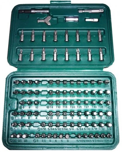 Uzgaļi: PHx25mm (0, 1, 2-5gab., 3); PZx25mm (0, 1, 2-5gab., 3); SLx25mm (3, 4, 4.5, 5, 5.5, 6, 6.5, 7, 8); HEXx25mm (1.5, 2, 2.5, 3, 4, 5, 5.5, 6, 8, 1/16', 5/64', 3/32', 7/64', 1/8', 9/64', 5/32', 3/16', 7/32', 1/4'); HEX TAMPERx25mm (2, 2.5, 3, 4, 5, 6, 1/8', 9/64', 5/32', 3/16', 7/32', 1/4'); TORXx25mm (8, 10, 15, 20, 25, 27, 30, 40, 45); TORX TAMPERx25mm (8, 10, 15, 20, 25, 27, 30, 40, 45); SPLINEx25mm (M5, M6, M8); ROBERTSONx25mm (0, 1, 2, 3); TORQx25mm (6, 8, 10); SPANNERx25mm (4, 6, 8, 10); TRI-WINGx25mm (1, 2, 3, 4); CLUTHx25mm (1, 2, 3). Magnētiskais adapters uzgaļiem 60mm; uzgalis 'Y' 1/4'; adapters muciņām 1/4' 25mm; adapters muciņām 1/4' 50mm; adapters uzgaļiem 1/4'