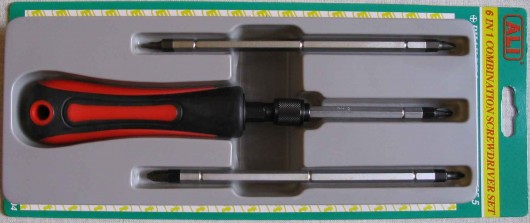 Komplekts: skrūvgriezis un trīs abpusēji uzgaļi: PZ1-PZ2, PH1-PH2, SL4.5-SL5.5. Uzgaļa garums 170mm. Tērauds S2. Gumijas rokturis.