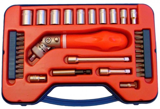 Skrūvgriezis lokans 1/4', muciņas 1/4': 5-6-7-8-9-10-11-12-13-14mm, pagarinātāji 1/4': 50mm, 100mm, adapteris 1/4', uzgaļi: TX, PZ, PH, SL