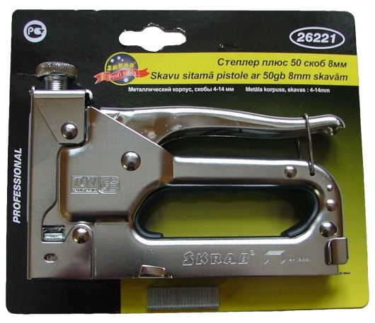 Metāla rorpuss. Skavas: 4-14mm, platums 10-13mm, biezums 0.7mm. Triecienspēka regulēšanas skrūve.