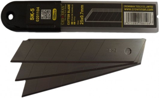 Nomaināmi 25 mm tapetes nažiem. Asmens biezums 0.5 mm. 10 asmeņi. Plastmasas iepakojums. Asmeņi paredzēti kartona, linoleja, paklāju, šindeļu, dažāda veida plēvju un citu būvmateriālu griešanai.