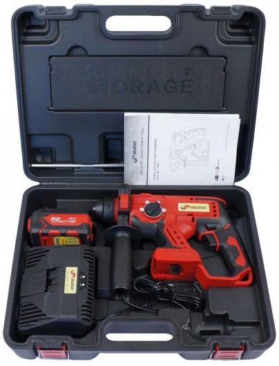Komplekts: bezvadu perforators, akumulators 4A, lādēšanas ierīce, kārba. Bezvadu perforators, 20V, 4A, SDS+, bezoglīšu tipa motors, trieciens 1,7 Dž, ātrums 0-1400 apgr/min, 3 režīmi: urbjmašīna, triecienurbjmašīna, āmurs, apgaismojums, 1.8 kg