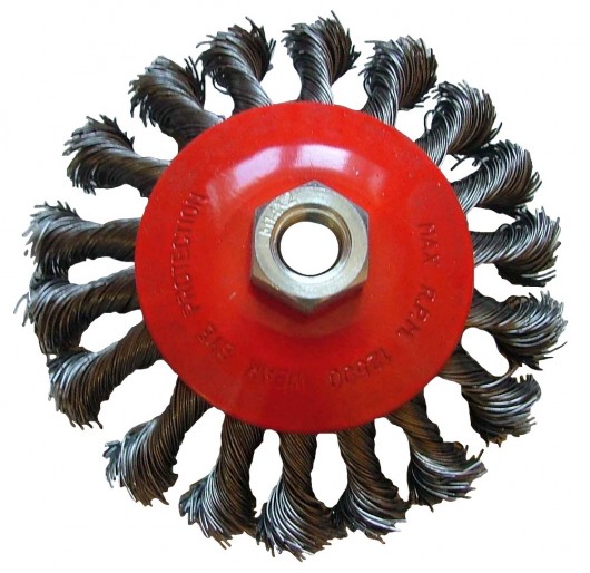 Birste metāla ar 115 mm diametru ar savītu tērauda stiepli tiek izmantota metāla, betona un koka rupjai apstrādei (tīrīšanai), izmantojot leņķa slīpmašīnu.