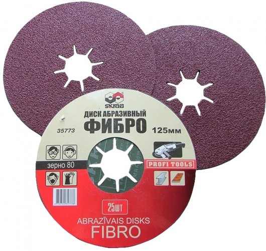 Disks fibro paredzēts metināto šuvju slīpēšanai, virsmu tīrīšanai no rūsas, katlakmens, lakas, krāsas, sveķiem un apstrādātu virsmu sagatavošanai apdarei. Diametrs 125 mm. Iekšējais diametrs - 22 mm. Leņķa slīpmašīnai. Grauds P80. Abrazīvs: alumīnija oksīds. Apļa pamatne ir stikla šķiedra. Dzesēšana ar ūdeni nav atļauta.
