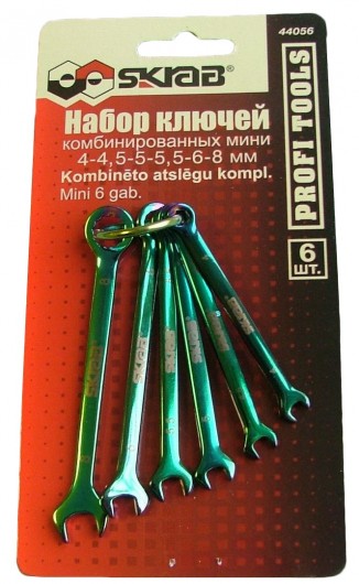 Набор ключей комбинированных рожково-накидных (12 граней) на колечке. Размеры 4-4.5-5-5.5-6-8 мм. Нержавеющая сталь CrV. Антикоррозийное покрытие. Ключи имеют специальную проточку, благодаря которой достигается оптимальный захват граней.